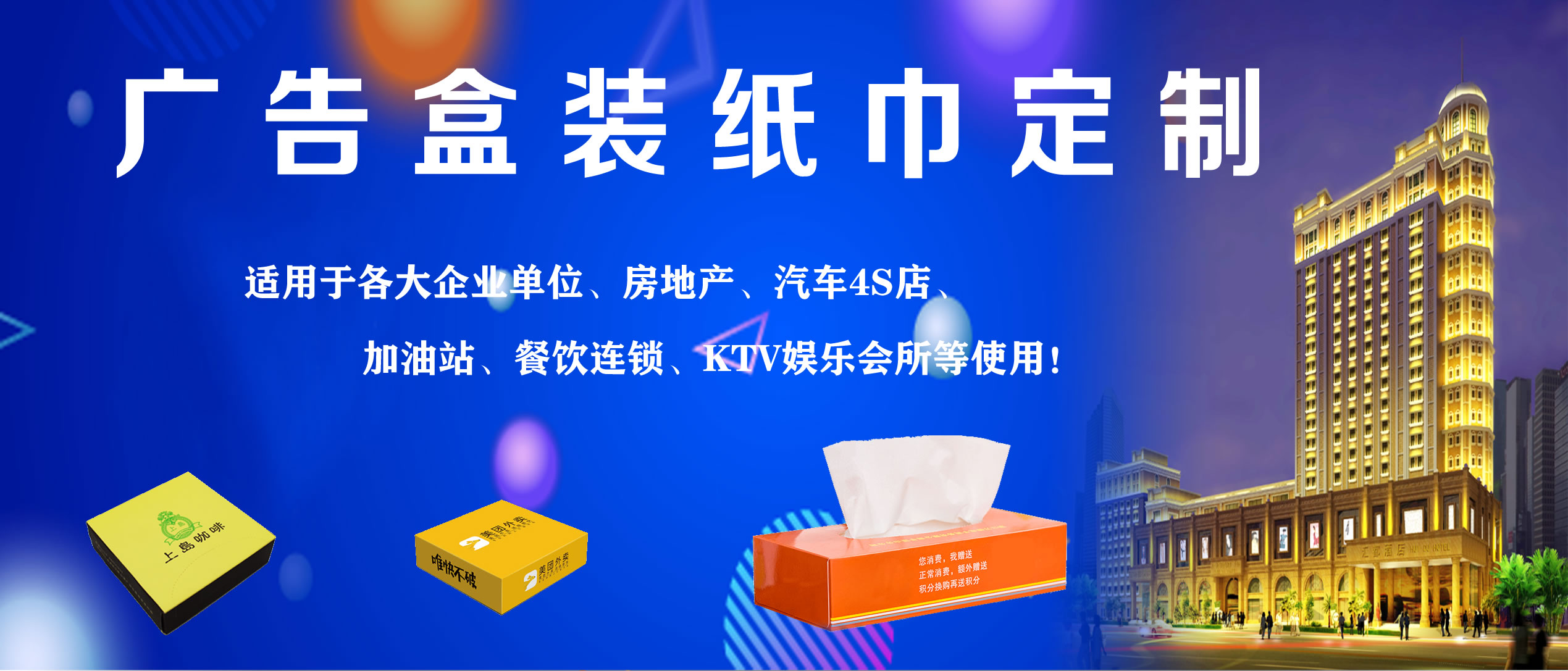 合肥億竹紙品包裝有限公司是一家專業從事各種生活用品定制的企業,定制熱線:18919603840(周經理)。公司與各大餐飲行業、酒店、加油站、學校、KTV娛樂會所、銀行、汽車4S店、房地產、廣告公司等客戶長期合作,業務覆蓋安徽全省。公司主營產品:廣告盒抽定制、餐巾紙定制、大盤紙、擦手紙、散抽紙等。有著完善的生產硬件設備和專業技術,及長期從事的豐富經驗。 我廠專注生活用品多年,致力于生產“精致,高端,綠色,健康”于一體的優質產品,以誠信、實力和產品質量獲得業界的認可。目前我廠產品已深得寶馬汽車、重慶劉一手火鍋餐飲連鎖、萬達集團、綠地集團等眾多客戶的青睞,業務量不斷攀升。